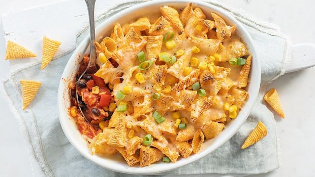 Heerlijk Mexicaans mengsel van kip en groenten in een kruidige tomatensaus onder een laagje Bugles chips en gegratineerde kaas.