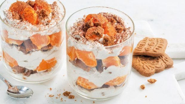 Tiramisu met laagjes room en speculaas met frisse partjes mandarijn. Leuk als sinterklaasrecept of als feestelijk dessert.