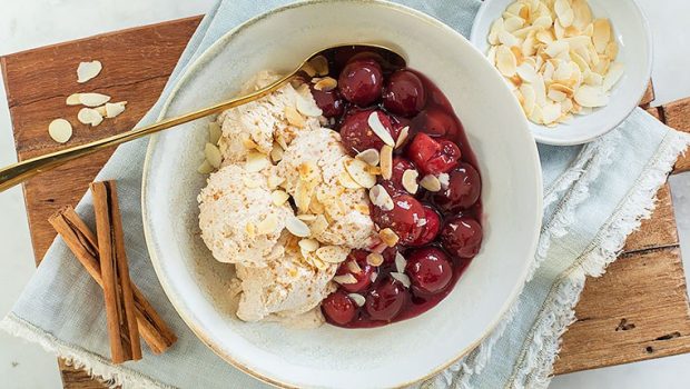 De perfecte combinatie van zoete warme kersen geserveerd met zelfgemaakt romig kaneelijs en knapperige amandelen