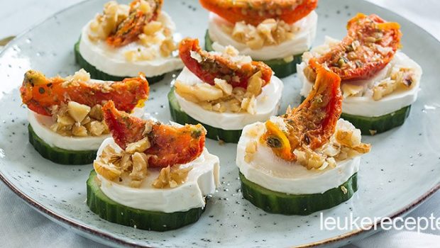Gezonde en frisse hapjes van komkommer met romige geitenkaas, walnoten en zongedroogde tomaat