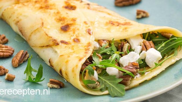 Hartige pannenkoeken met peer gevuld met rucola en geitenkaas