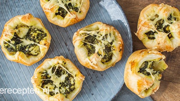 Lekker borrelhapje op een feestje of voor bij de lunch van knapperig bladerdeeg gevuld met romige spinazie en feta kaas