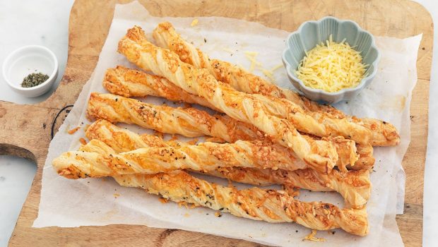 Een knapperige en hartige snack van bladerdeeg met oude kaas en oregano. Een ideaal borrelhapje voor op een feestje.