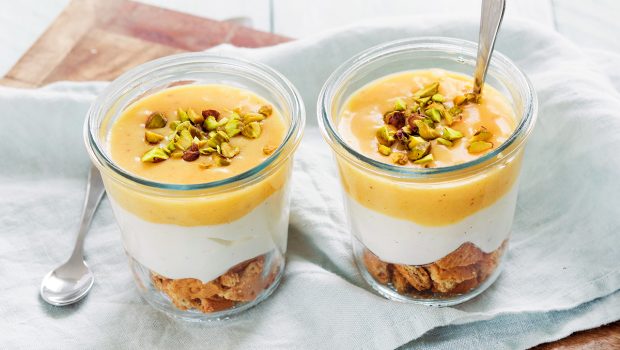 Snel en makkelijk toetje van vanilleroom met koekjes en lemon curd.