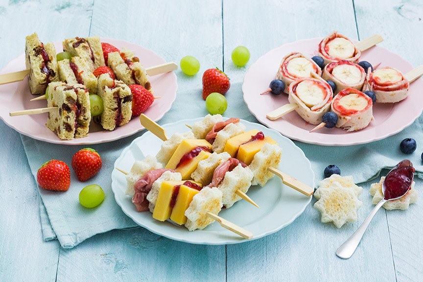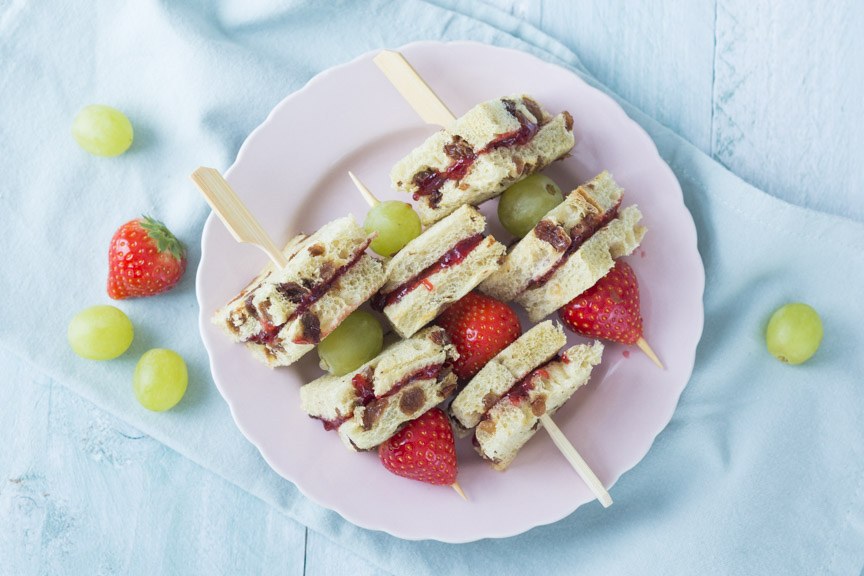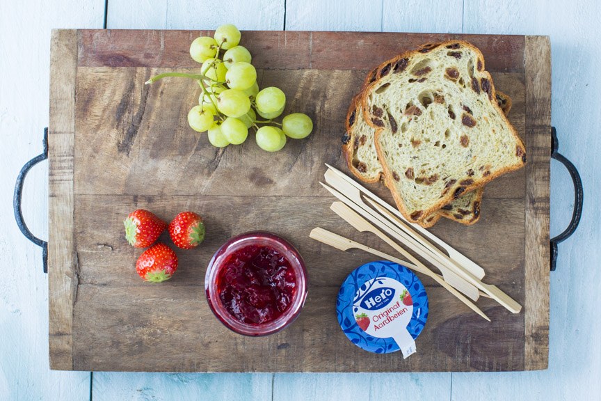 Snijd elk sneetje rozijnenbrood in vier stukken (met of zonder de korst). Besmeer de helft van de stukken brood met jam en dek af met de andere helft. Prik ze aan een prikker afgewisseld met een aardbei en druif.