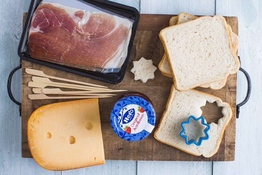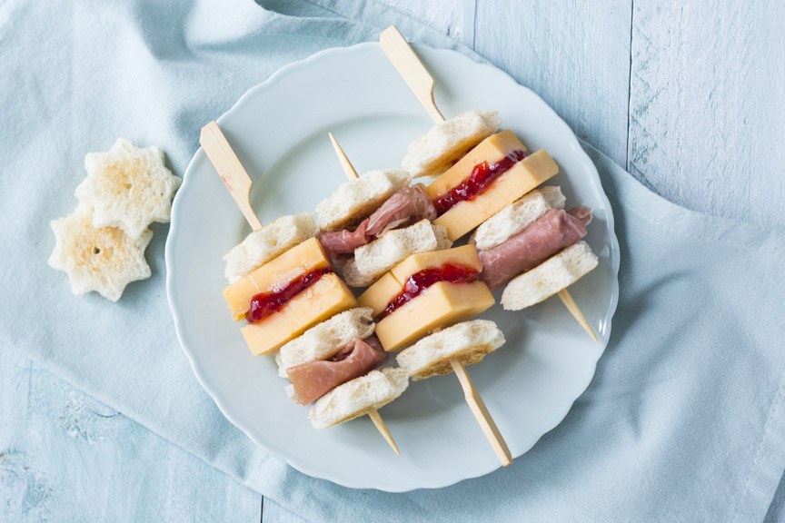 Snijd het stuk kaas in 12 stukken van ca. 3 bij 3 cm en een halve cm dik. Besmeer 6 stuks met jam en leg de andere stukken daarop. Druk met een uitsteker sterren uit het brood en rooster deze kort in een droge koekenpan of in de oven iets krokant. Prik de dubbele kaas voorzichtig aan een prikker afgewisseld met broodsterren en een plakje parmaham.