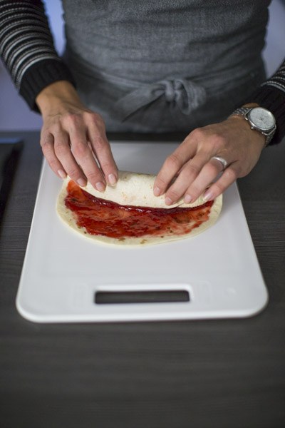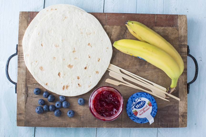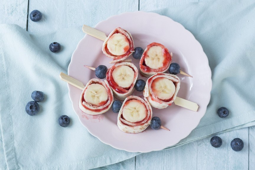 Zorg dat de wraps ongeveer dezelfde grootte hebben dan de bananen. Besmeer de wraps aan een zijde met jam. Leg de banaan er op en rol deze er in. Snijd voorzichtig met een scherp met in ca. 6 plakken. Prik ze aan een prikker met een blauwe bes er tussen.
