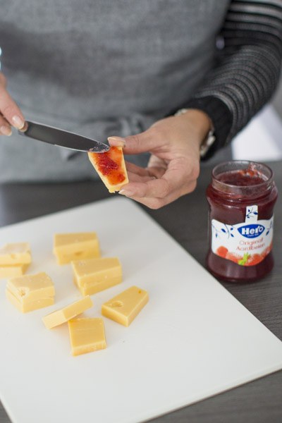 Kaas prikkers met jam en parmaham ā 8 stuks