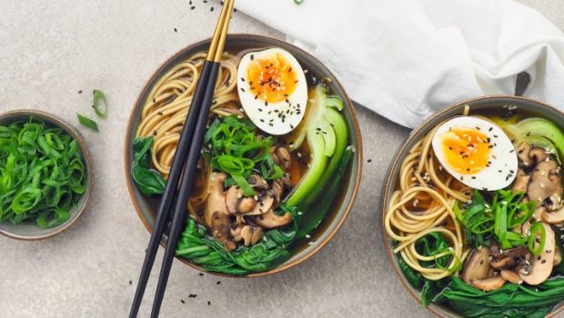 Een vegetarische variant op de Japanse ramen, gevuld met noedels, paddenstoelen, paksoi en een gekookt ei