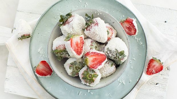 Hele simpele en lekkere ijskoude snack van bevroren aardbeien met kokos, altijd lekker om een voorraadje van in de diepvries te hebben in de zomer