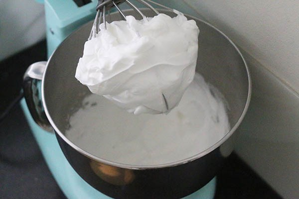 Klop de eiwitten stijf in een schone kom en met een schone mixer. En zorg ervoor dat er geen eidooier bij de eiwitten zit. Klop de andere 200 ml van de slagroom lobbig met een mixer in een aparte kom. Voeg de gesmolten chocolade met gelatine toe aan de slagroom en klop er doorheen. Spatel als laatste de opgeklopte eiwitten erdoor.
