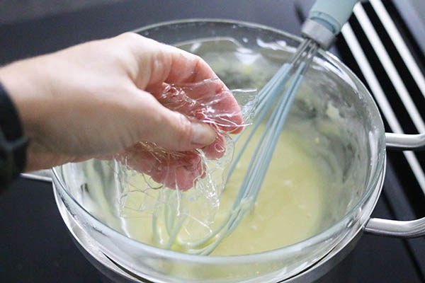 - Zorg dat het water in de pan niet kookt, het hoeft alleen maar warm genoeg te zijn om de chocolade te smelten. Als de witte chocolade te heet wordt dan wordt hij korrelig en hard.