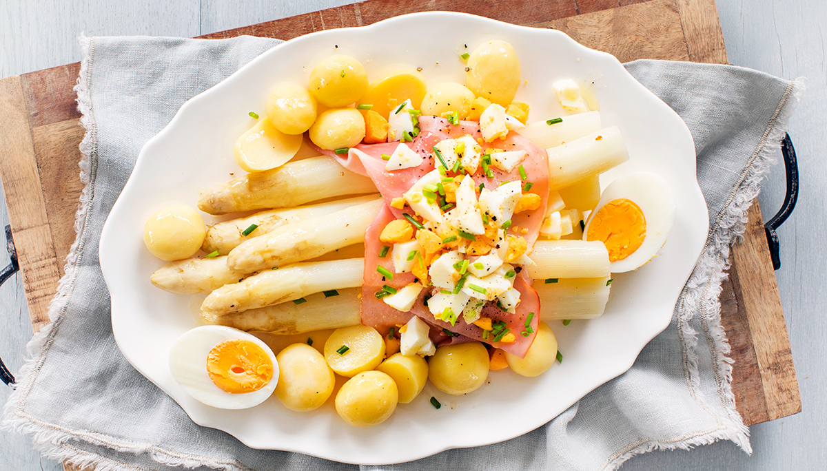 Als het aspergeseizoen begint, maak ik bijna altijd als eerste deze klassieke asperges met ham en ei. Het is voor mij echt zo’n voorjaarsgerecht waar ik meteen zin in krijg. De combinatie van zachte witte asperges, kruimige krieltjes, ei en gesmolten boter is simpel maar precies goed. Als Limburger heb ik dit gerecht al vaak gegeten maar het verveelt nog niet. Juist omdat de ingrediënten zo puur zijn, komen de asperges hier helemaal tot hun recht.