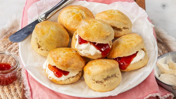 Deze Britse scones maak ik vaak als ik iets feestelijks wil serveren dat snel klaar is. Ze rijzen mooi in de oven en zijn binnen een half uurtje klaar. Vanbinnen lekker zacht, met een licht krokant randje. Ik eet ze het liefst warm met clotted cream en jam, maar mascarpone en lemon curd zijn ook heerlijke opties voor bij het ontbijt of een zelfgemaakte high tea.