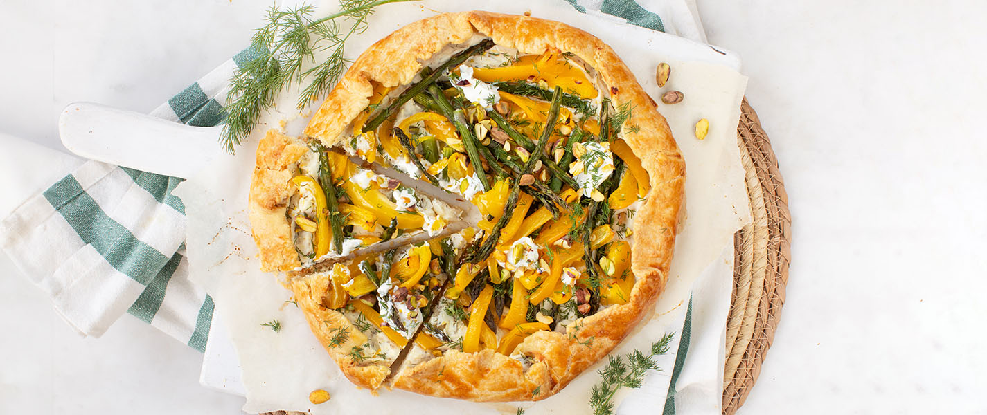 Een galette is een hartige Franse open taart met een rustieke korst. Je kunt deze vullen met hartige en zoete vullingen. In dit recept ging ik voor groene asperges, paprika en een frisse ricotta met citroen en dille Echt een super combinatie en ideaal voor Pasen voor bij de paasbrunch.