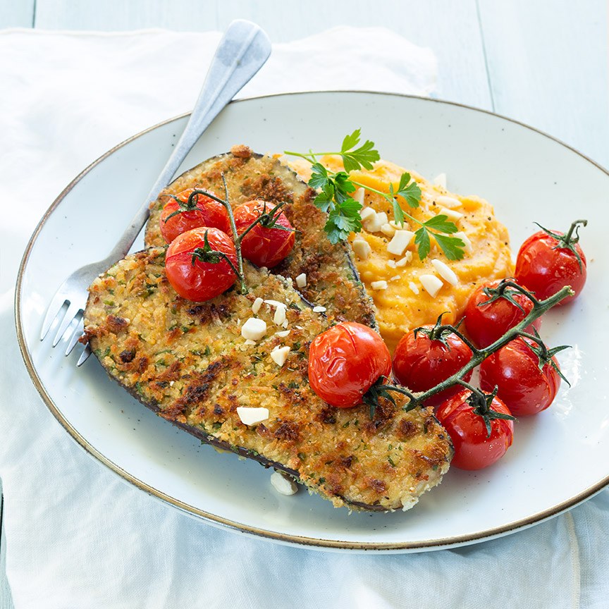 2. Haal de plakken aubergine eerst door het de bloem, dan door het ei en vervolgens door de panko. Bak de aubergines in een koekenpan met een beetje olie of margarine, ca 4 minuten aan iedere zijde tot ze mooi goudbruin zijn. Verwarm de zoete aardappelpuree en schep deze op een bord, serveer met de vega aubergine schnitzels en de gepofte tomaatjes en garneer met wat amandel en een takje of wat fijngehakte peterselie.