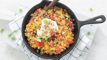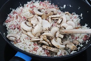 1. Bak de spekjes in een droge pan iets krokant. Haal eventueel iets van het vet en vocht uit de pan voordat je verder gaat. Maal de bloemkool roosjes fijn tot de grootte van rijst in een keukenmachine als je geen kant en klare rijst hebt gekocht (en voorkoken is bij beide niet nodig). Voeg de bloemkoolrijst toe en schep er door heen. Breng op smaak met een snuf tijm en wat zwarte peper. Bak dit 2 minuutjes en schep dan ook de champignons in plakjes er door.