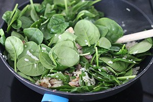 2. Zodra deze beginnen de slinken voeg je de spinazie toe en bak je dit tot hij ook geslonken is. Serveer het gerecht in een kom en kruimel wat geitenkaas en pecannoten over.