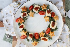 8. Verdeel de tomaatjes, olijven, komkommerrolletjes, bladerdeegsterren, blokjes kaas (ook leuk om uit te steken met een vormpje) en noten over de feestelijke borrelkrans.