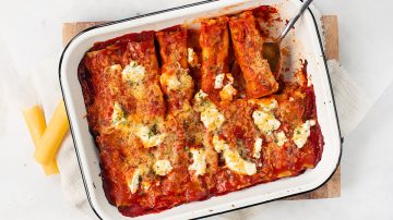 Tip: zorg dat de cannelloni goed onder de saus zit. Dit helpt bij de garing en voorkomt verbranding in de oven.