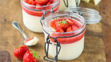 8. Giet voorzichtig een dun laagje van de citroengelei op de opgesteven panna cotta en zet nog 30 tot 60 minuten terug in de koelkast tot ook de gelei stevig is.
