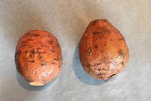 3. Neem de zoete aardappels uit de oven en snijd ze in het midden open. Schep of snijd de vulling eruit, meng in een kom met het kipmengsel en vul de zoete aardappels hiermee. Garneer de gevulde zoete aardappels met in stukjes gesneden avocado.