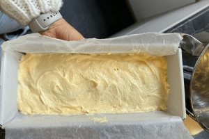 6. Vet het cakeblik in en doe er ook bakpapier in. Doe hier het beslag in.