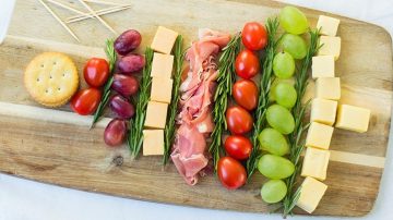 2. Leg de grissini stengel op een borrelplank en leg bovenin een rechthoekig vlak met cherrytomaatjes. Daaronder de iberico kaas, en daaronder de blauwe bessen. Zo heb je de Nederlandse vlag met rood, wit en blauw.
