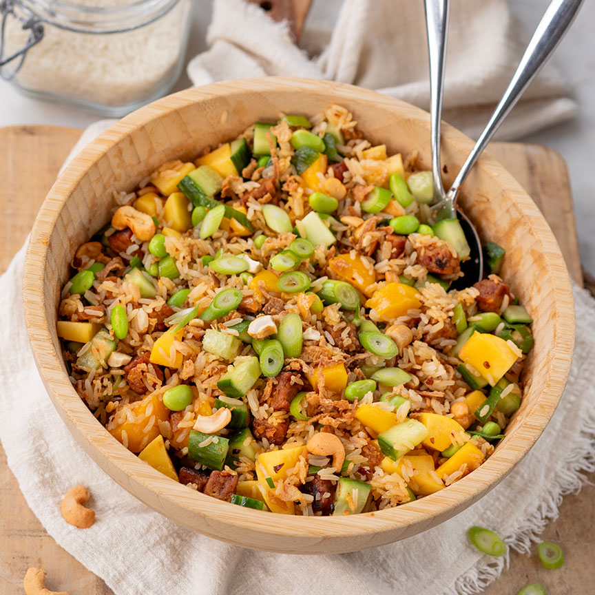 3. Snijd de mango in blokjes, de komkommer in halve plakjes en de bosui in ringetjes. Doe de crispy rijst in een ruime schaal en voeg de mango, gebakken tempeh, cashewnoten, edamame boontjes, komkommer, bosui en gefrituurde uitjes toe. Meng dit voorzichtig door elkaar.