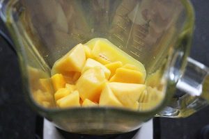 1. Snijd de mango in stukjes. Bewaar er een paar voor de garnering. Doe de rest in een keukenmachine of blender. Rasp de limoen bewaar dit apart. Pers de limoen uit en voeg het sap toe aan de mango. Voeg ook het ananassap toe en mix fijn tot een soepje. Bewaar het mengsel zolang in de koelkast.