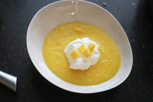 4. Tip: dit dessert is makkelijk al een dag van tevoren voor te bereiden. Schep de room dan pas voor het serveren in de mangosoep.