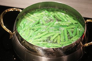 2. Roer dan ook de tomatenblokjes en de kokosmelk er door en een klein scheutje water. Laat 10 minuten pruttelen en voeg dan ook de boontjes toe en warm even mee. Proef of de sambal goreng telor goed op smaak is en voeg eventueel nog wat sambal, suiker, peper of zout toe of kokosmelk om hem zachter te maken. Lekker met wat rijst.