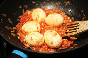 1. Kook de eieren hard in ca 8 minuten. Kook de boontjes in een pan met water, ook ongeveer 8 minuten beetgaar. Verhit een beetje zonnebloemolie in een pan en fruit de ui aan. Voeg de gember toe en de knoflook. Voeg de sambal (naar smaak), laos, suiker en tomatenpuree toe en roer goed door en laat een paar minuutjes aanbakken. Pel de eieren en voeg deze toe aan de pan.