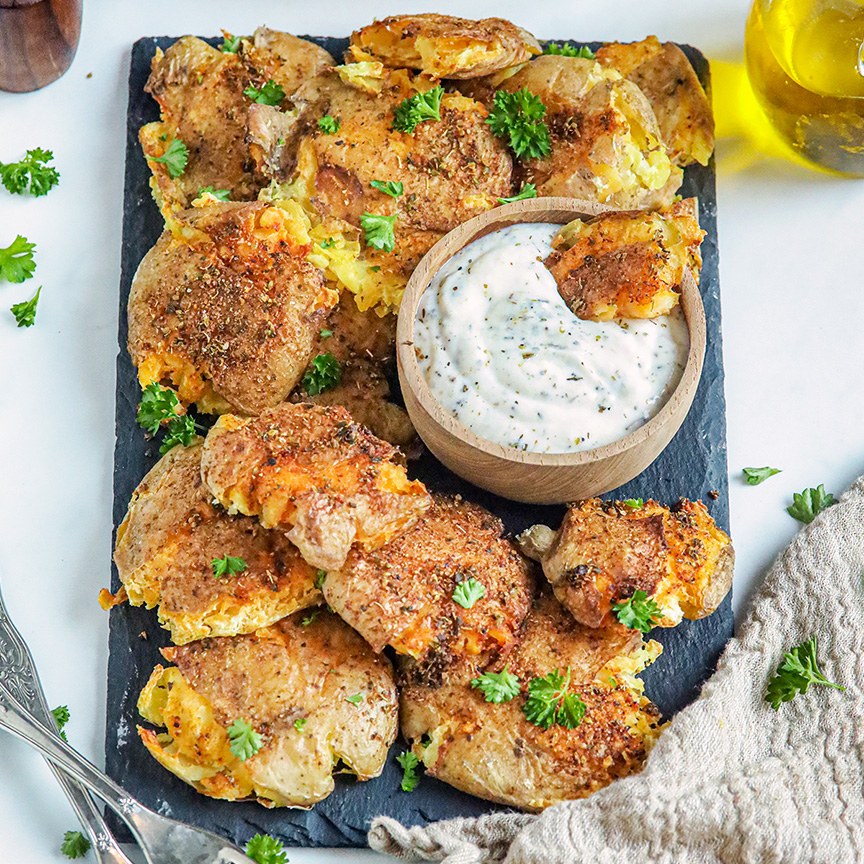 7. Serveer de aardappelen meteen met bijvoorbeeld wat (vegan) knoflooksaus.