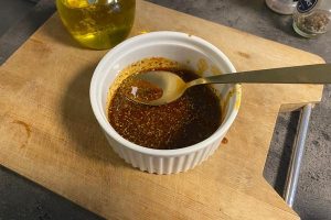 4. Mix de olijfolie met de knoflookpoeder, gerookte paprikapoeder, peper en wat zout in een kommetje. Hak de verse peterselie fijn en voeg deze toe. Mix nogmaals goed door elkaar.