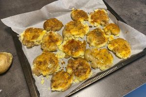5. Leg de gekookte aardappels op de bakplaat en druk ze plat met een glas. Bestrijk daarna het kruidenmengsel over de aardappelen. Gebruik hiervoor een kwastje.