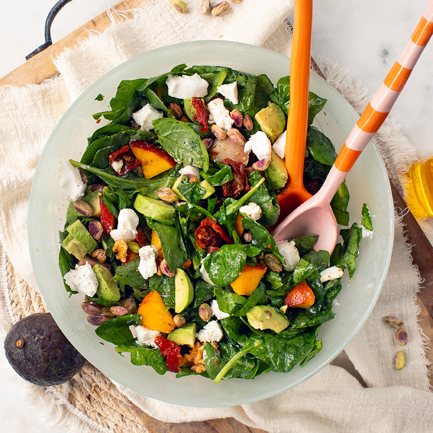 3. Voeg de avocado, perzik en gedroogde tomaatjes toe aan de spinazie. Hak de walnoten grof en strooi eroverheen.