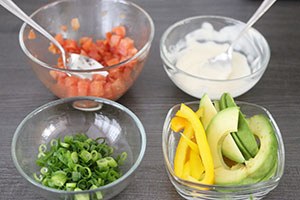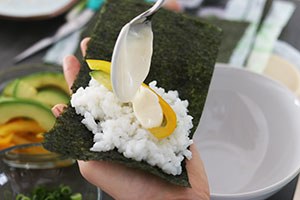 1. Begin met het koken van de sushirijst volgens de verpakking. Wanneer deze klaar is voeg je de sushi azijn hier aan toe. Snijd in de tussentijd reepjes van de paprika en avocado. Neem de zalmblokjes en marineer deze in de olie en sojasaus voor wat extra smaak. Meng de ingrediĆ«nten van de Japanse mayo. Snijd dunne ringetjes van de lente ui. Wanneer alle ingrediĆ«nten klaar staan, kun je de temaki’s afmaken. Neem de helft van een nori vel en beleg de linkerhelft met sushirijst.