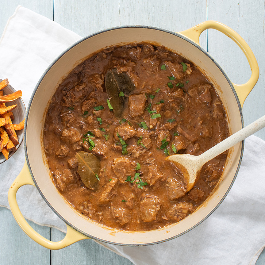 1. Snijd het vlees in grove stukken van ongeveer 3 cm. Dep het eventueel een beetje droog met keukenpapier, zo braadt het beter aan. Laat de boter smelten in een ruime braadpan en bak het vlees rondom bruin. Doe dit in porties als het niet in één keer past, dan krijgt het vlees een mooie korst.