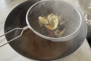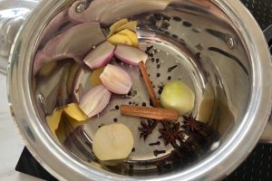 2. Voeg de ui, sjalotten, knoflook, gember, kaneelstokje, peperkorrels, kruidnagels en steranijs toe en bak 2-3 minuten droog op hoog vuur. Blijf het goed doorroeren. Voeg vervolgens de olie toe en bak nog 1-2 minuten door.