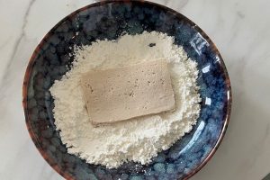 4. Bereid in de tussentijd de tofu. Haal de tofu uit de verpakking en dep het droog met een schone theedoek. Snijd het blok daarna in plakken van 0.5-1 cm dik en bedek ze met de maïzena.