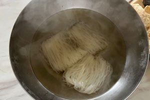 7. Doe ondertussen de rijstnoedels in een grote kom en giet er kokend water bij. Laat het 2-3 minuten staan, giet af en spoel ze daarna af met koud water.