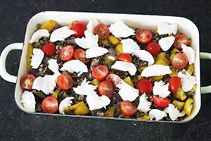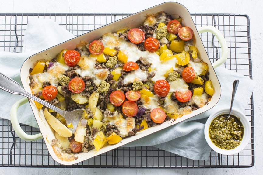 Zet het vuur uit (ik schepte nog 1 eetlepel pesto door het gehakt). Verdeel de aardappelblokjes over de bodem van een ovenschaal. Schep het vlees met de ui en paprika eroverheen. Verdeel vervolgens de tomaatjes en mozzarella er over. Zet het geheel nog 10 -15 minuten in de oven tot de mozzarella gesmolten is. Serveer met een beetje pesto.