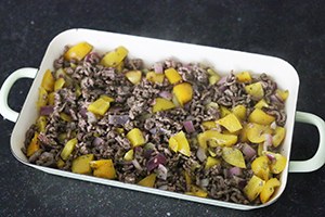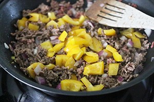 Verwarm de oven op 200 graden. Snijd de ui, paprika, mozzarella en cherrytomaatjes in stukjes. Schil zonodig de aardappels en snijd ze in blokjes (ik gebruikte aardappelpartjes uit zak). Bak de aardappels circa 18 minuten in een pan met een scheutje olie (ik bakte ze maar 12 min omdat ze al iets voorgekookt zijn uit zak). Giet een scheutje olie in een andere pan en bak hierin het gehakt. Als het gehakt gaar is voeg je de ui en paprika toe; bak dit een paar min mee.
