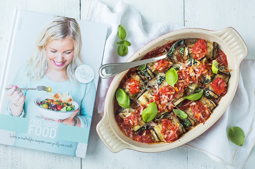 Ook heb ik al een aantal recepten uit het boek mogen proeven tijdens de boeklancering van Feel Good food (lucky me!). En wat hebben we zitten smullen. Van de kom doperwtensoep met makreel tot de fattoush salade en het pure chocoladetaartje. Thuis ben ik ook de keuken in gedoken en maakte de aubergine canneloni die je terug vindt in het hoofdstuk ‘diner’. Het is een lekker licht recept zonder vlees en weinig koolhydraten maar toch had ik een vol en goed gevoel na het eten.