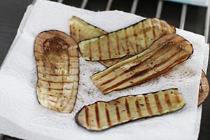 Snijd de aubergines (eventueel met een mandoline) in dunne plakken. Laat een grillpan goed heet worden. Bestrijk de plakken met de kruidenolie. Grill de aubergine aan beide kanten goudbruin en laat uitlekken op een papiertje. Maak dan de tomatensaus: pel en snipper de ui en hak de knoflook en halve rode peper zonder zaadjes fijn en fruit dit aan in een beetje olijfolie. Voeg de tomatenblokjes toe en breng op smaak met peper, zout, oregano en basilicum. Laat 10 minuutjes pruttelen.