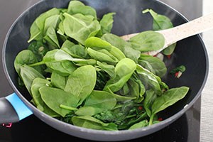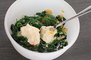 Verwarm de oven op 200 graden. Snipper de andere ui fijn en hak de knoflook en halve rode peper fijn. Fruit dit ook aan in een pan met een scheutje olijfolie. Voeg beetje bij beetje de spinazie toe tot deze geslonken is. Laat deze daarna uitlekken in een zeef en druk het vocht er uit met een lepel. Meng de spinazie met ricotta en een snufje peper en zout. Verdeel ongeveer 2/3 van de tomatensaus over ƩƩn grote of twee iets kleinere ovenschalen.