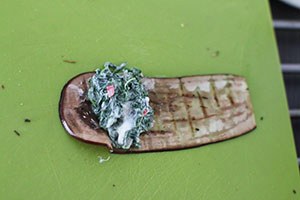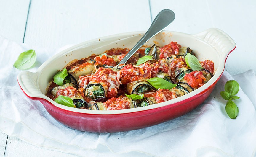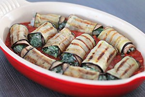 Neem een plak gegrilde aubergine en leg een schepje van het spinaziemengselĀ hierop en rol op. Leg de rolletjes in de tomatensaus. Verdeel de rest van de saus over de cannelloni rolletjes. Bestrooi met de parmezaanse kaas en zet 15 min in de oven. Bestrooi eventueel met wat verse basilicum.