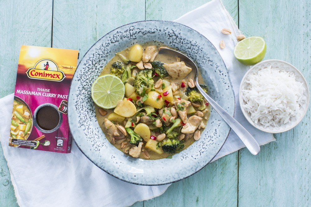 De massaman curry is over het algemeen wat milder en zachter dan de andere curries uit de Thaise keuken. Daarom is hij ook ideaal als je niet zo van pittig eten houd of als je op een milde manier kennis wil maken met de Thaise keuken. In mijn recept gebruik ik de Massaman curry pasta van Conimex, deze is heerlijk van smaak en proeft net als de authentieke curry uit Thailand. Je haalt hem gewoon in de supermarkt dus je hoeft niet speciaal naar de toko en je gerecht is ook nog eens binnen een mum van tijd klaar.