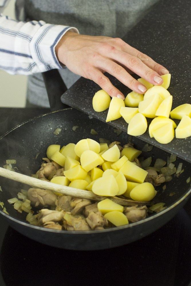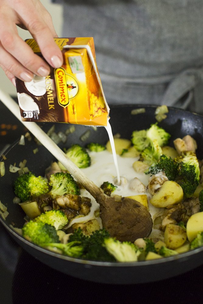 Snipper de ui en snijd de kip in blokjes. Verhit een beetje olie in een pan en fruit de ui aan en voeg vervolgens de kip toe. Als deze rondom is gebakken voeg je de aardappels in blokjes toe en de broccoli in kleine roosjes. Doe de Conimex Massaman Curry Paste er bij en de kokosmelk en 150 ml water.